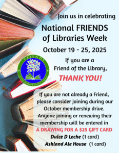 The Friends are always looking for more people to help with our events and activities. If you would like to learn more about our group, you can drop in on one of our monthly meetings or email the President of the Friends of the Ashland Library.